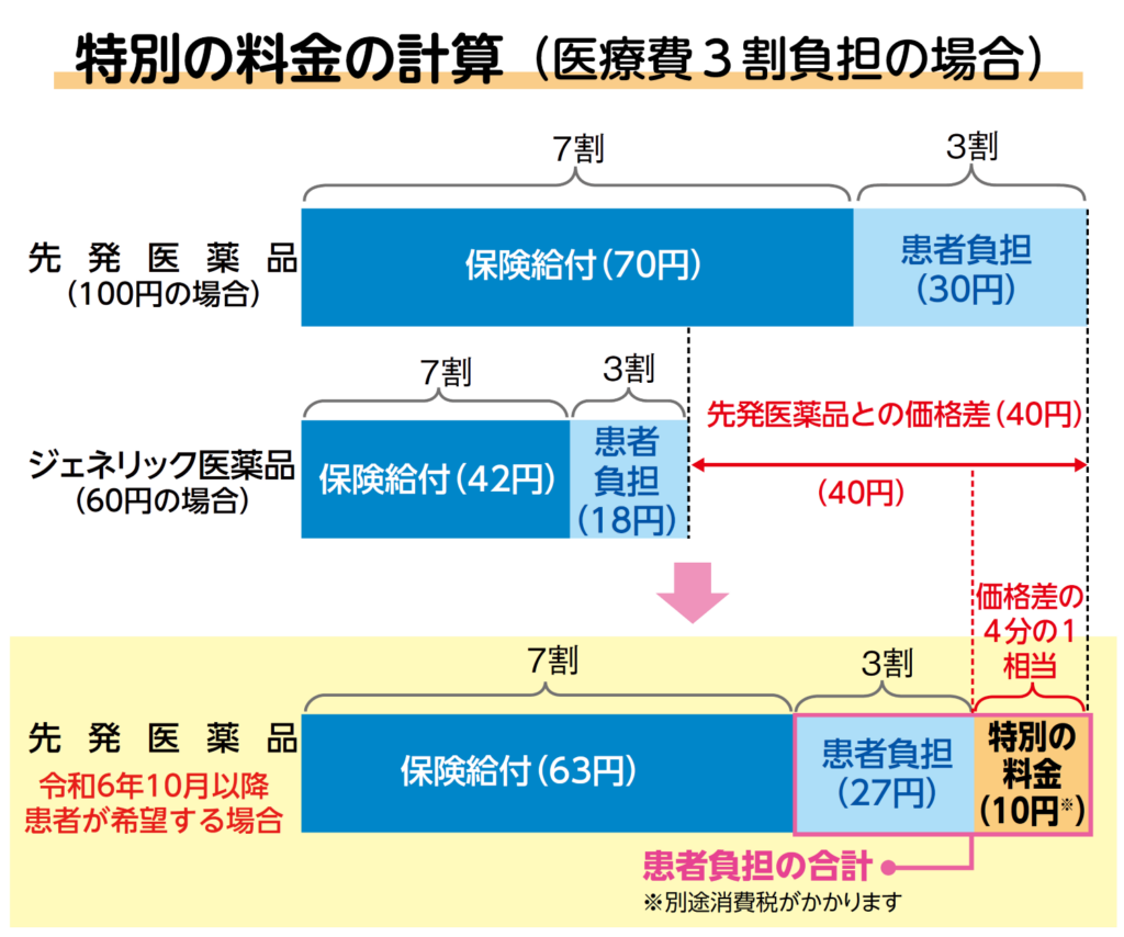令和6年10月1日より、ジェネリック医薬品があるにもかかわらず、薬の有効性とは関係のない理由であえて先発医薬品を希望する場合には、医療費の自己負担(1割~3割)にプラスして特別料金がかかる仕組みになっています。