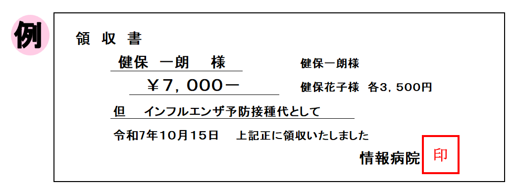 ●接種者氏名 ●接種年月日 ●接種料金 ●医療機関名 ●領収印 ●インフルエンザ予防接種代である旨